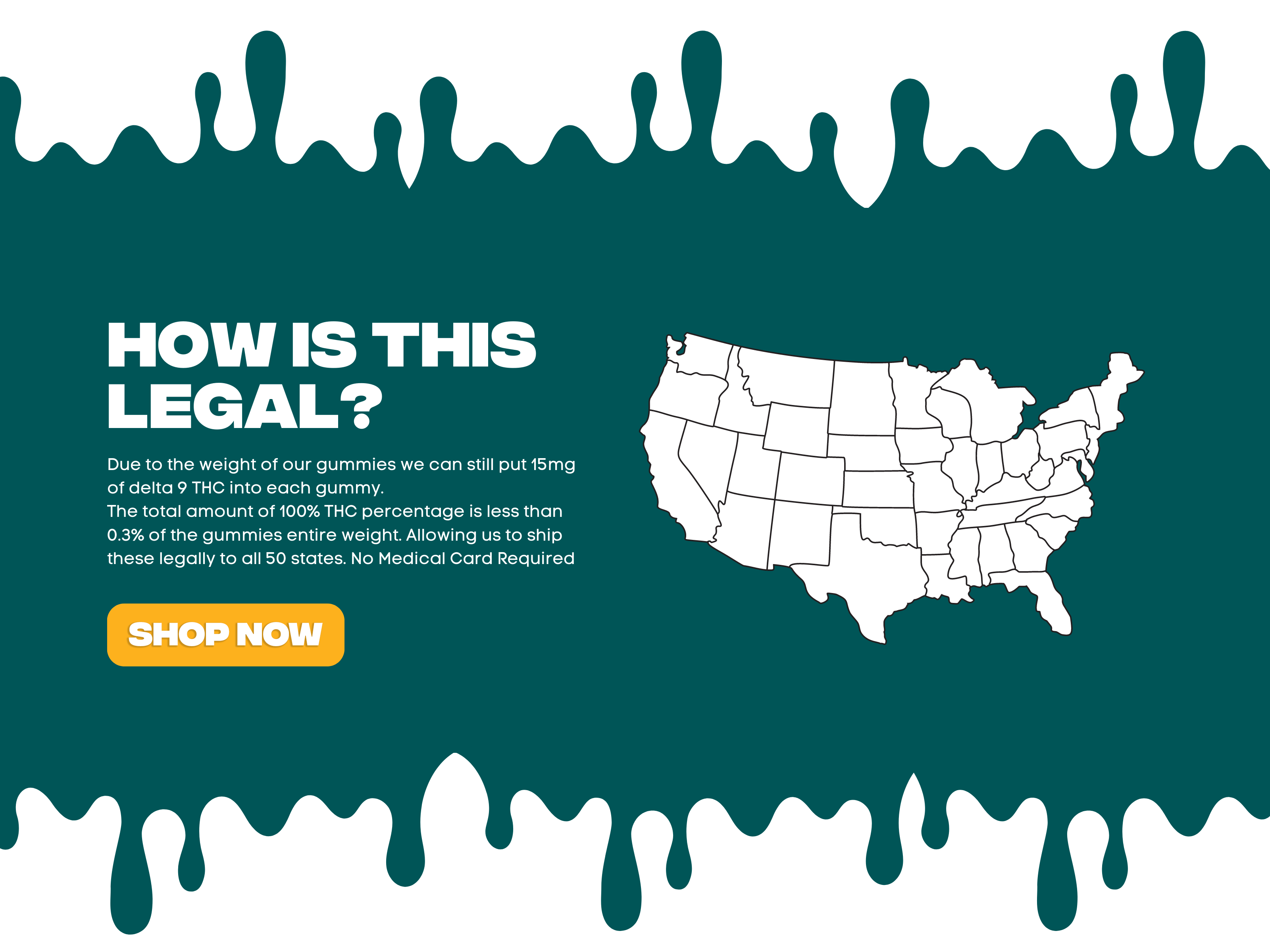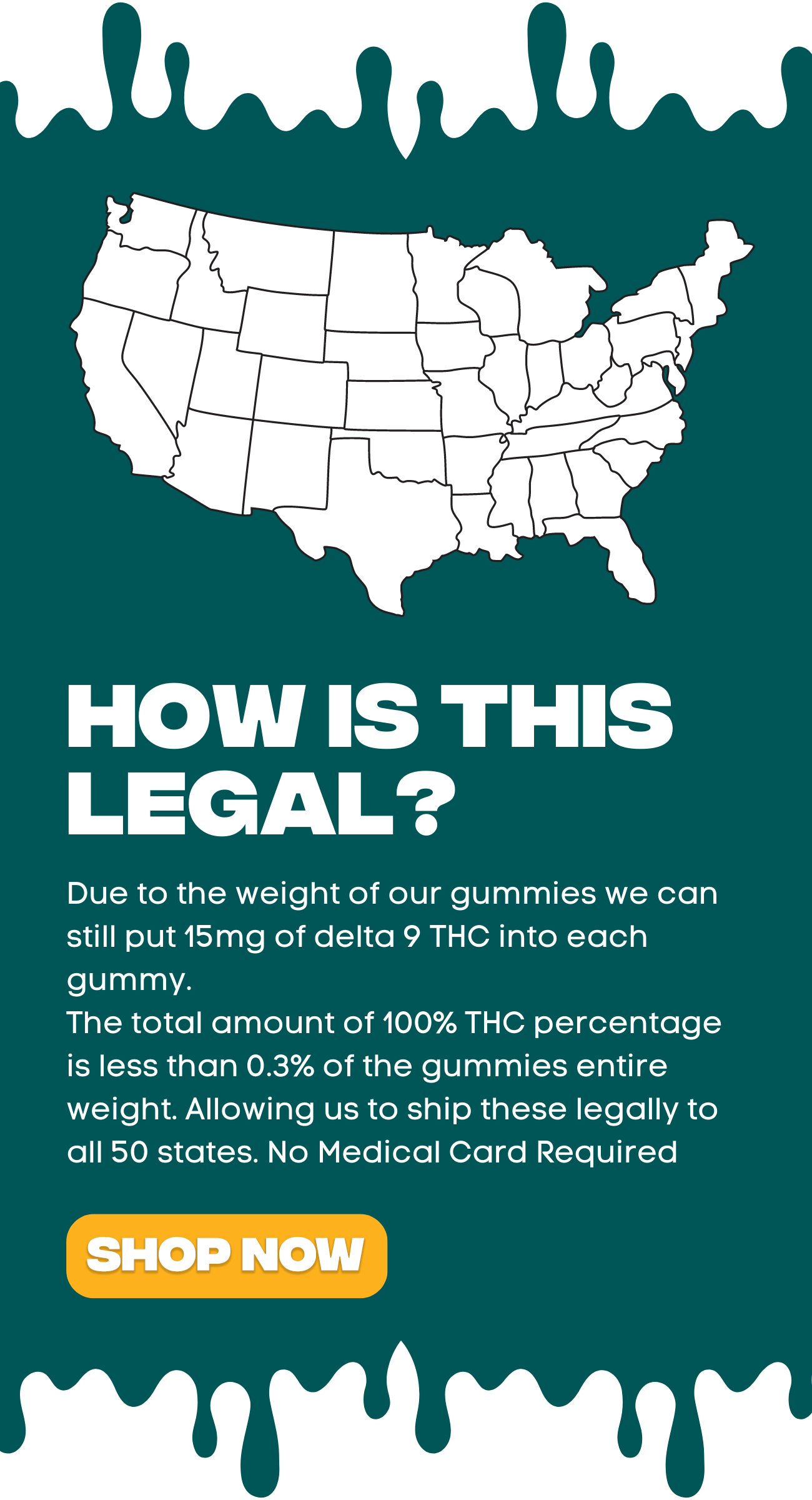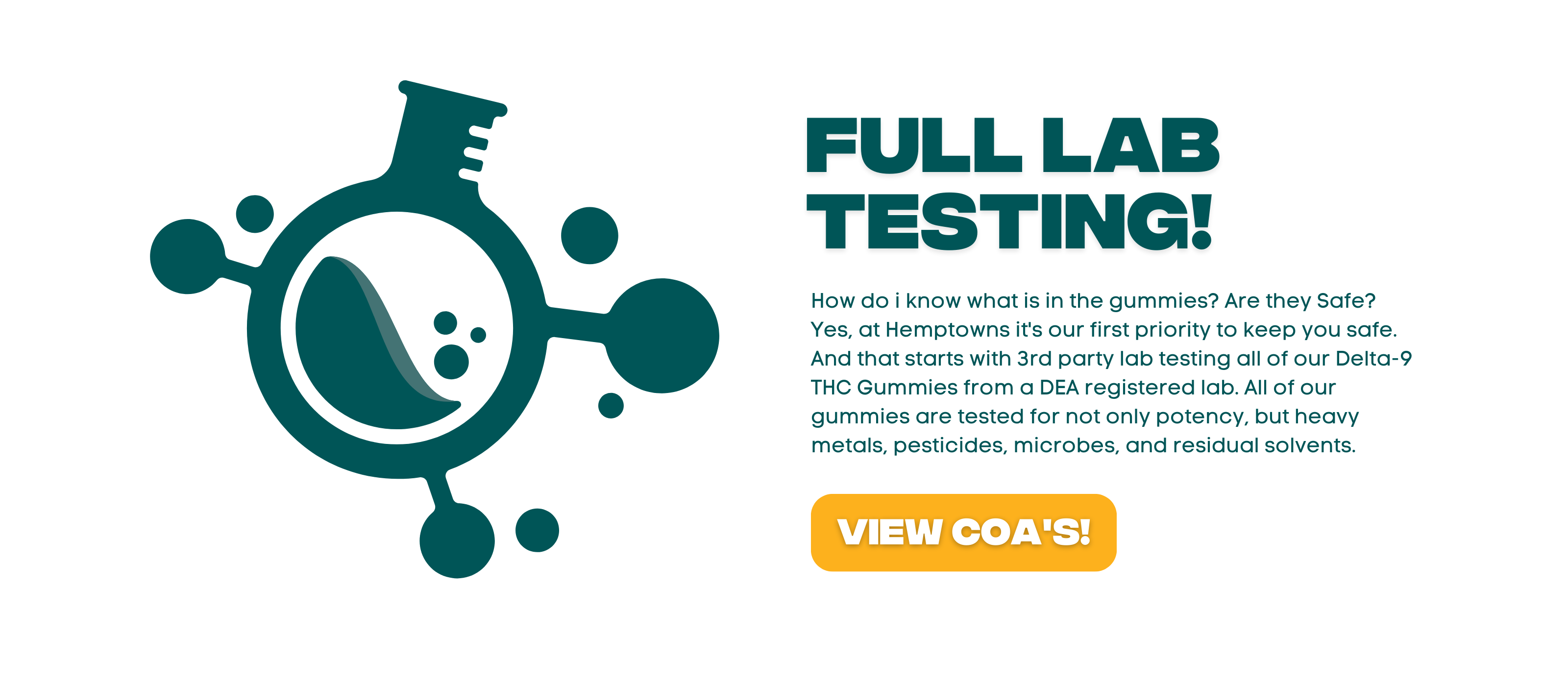 Thanks to the 2018 Farm Bill, Hemp-derived products containing less than 0.3% Delta-9 THC by dry weight are considered federally legal. All Hempstown Delta-9 Gummies are lab tested to ensure they meet this requirement. While our Delta-9 Gummies are considered federally legal, every state has different laws regarding the use of Hemp-derived products. Please check your local and state laws before enjoying Delta-9 Gummies.